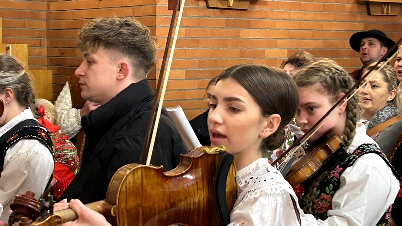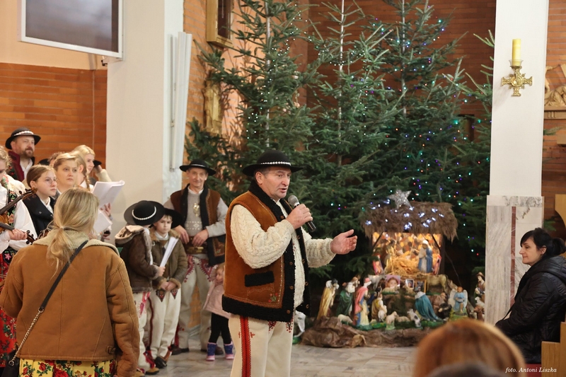 W dniu dzisiejszym w naszej parafii gościliśmy Zespół Słopniczanie, który przybył do nas na zaproszenie naszego księdza proboszcza Marka. Członkowie zespołu ubogacili dzisiejszą liturgię śpiewem kolęd. Po Mszy św. zaprosili wszystkich do wspólnego kolędowania. Zespół Słopniczanie prezentuje folklor Górali Białych, od Łącka do Kamienicy. Muzyka gra w składzie lachowskim w związku z dużym wpływem na folklor słopnicki, leżącej w regionie lachowskim Limanowej. Piosenki, tańce i melodie z repertuaru Słopniczan są odzwierciedleniem zachowanych do dzisiaj zwyczajów i obrzędów: Wesele Słopnickie, Baciarka, Omłocek, Śmigus, a także zwyczaje związane z Bożym Narodzeniem: Jasełka i kolędy z Herodem i Turoniem.