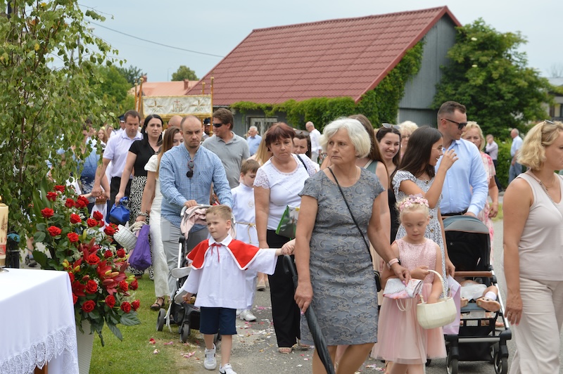 W naszej parafii tego dnia uroczysta Msza święta miała miejsce o godz. 11.00. Po niej wyszliśmy w procesji eucharystycznej na drogi naszej parafii. Przeszliśmy główną drogą, zatrzymując się przy czterech ołtarzach, przygotowanych przez naszych parafian. Przy każdym ołtarzu odczytywane były fragmenty Ewangelii mówiące o Eucharystii. W przebieg procesji zaangażowało się wielu naszych parafian. Warto wymienić: dziewczynki sypiące kwiaty, dzwoniących chłopców, Liturgiczną Służbę Ołtarza, parafian którzy nieśli chorągwie - symbole naszej wiary, druhów OSP niosących baldachim.