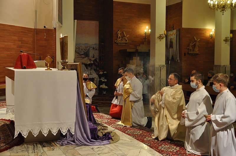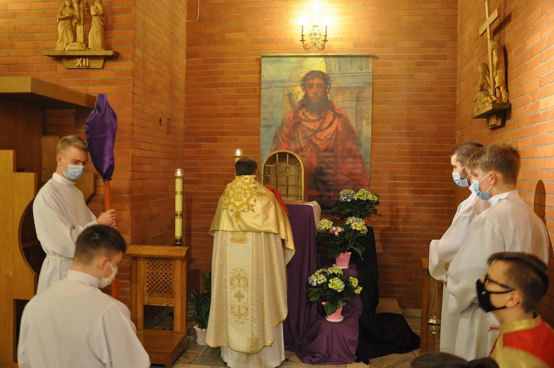 Druga część obrzędów Wielkiego Czwartku wyraźnie nawiązuje do tajemnicy męki i śmierci Pana Jezusa. Po Ostatniej Wieczerzy Pan Jezus udał się do Ogrodu Oliwnego i tam czekał na swoich siepaczy. Kiedy ci przyszli, oddał się dobrowolnie w ich ręce dla zbawienia rodzaju ludzkiego. Nocą został zaprowadzony przed Sanhedryn, czyli przed Wielką Radę Żydowską, która pod przewodnictwem najwyższego kapłana, Kajfasza, wydała na Niego wyrok śmierci. Ponieważ jednak według prawa żydowskiego wyroki zapadłe w nocy były nieważne, dlatego w Wielki Piątek z rana ponownie zebrała się Rada Żydowska, aby nocny wyrok potwierdzić. W międzyczasie zawiedziono Pana Jezusa do więzienia i tam straż kapłańska znęcała się nad Chrystusem w najokrutniejszy sposób. Na pamiątkę tych bolesnych dla Pana Jezusa godzin, pod koniec liturgii kapłan wynosi eucharystycznego Chrystusa do kaplicy przechowania, zwanej "ciemnicą", gdzie odbywa się adoracja eucharystyczna.